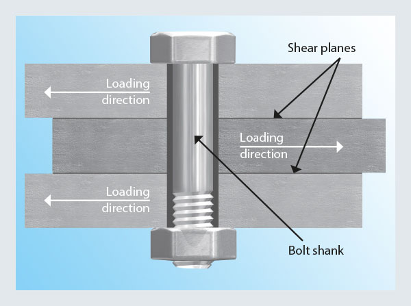 Under shear load (see the illustration), the bolt experiences force perpendicular to its axis. Shanks with larger areas and the absence of stress concentration points increase the bolt’s performance in shear loading. For this reason, designers should ensure that the shear plane is across the shank, not the threads.