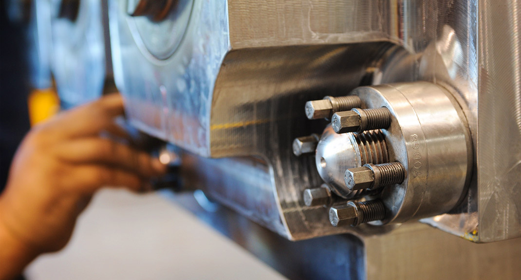 In normal bolted joints, the stress concentration of loads on the first 1-2 threads is one of the main reasons why a bolted joint fails. With a joint utilizing Superbolt multi-jackbolt tensioners, as the jackbolts are torqued to stretch the stud/bolt, the tensioner body radially flexes in at the top and flexes out at the bottom. This flexing action transfers the load from the first few threads and distributes the load evenly throughout the entire engaged thread length between the tensioner and stud/bolt. This simple flexing action dramatically increases the strength of the joint by reducing the stress concentrations on the first couple of threads.