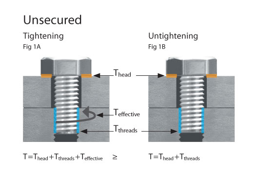 While untightening, provided that the assembly remains in the same condition, the applied torque only has to overcome frictional forces. As a result, untightening a fastener requires a lower torque (see Fig. 1B).