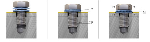 Upon tightening the fastener, the washers flatten and the serrations engage the contact surfaces. Since the cam angle (α) is greater than the thread pitch (β), the wedge-locking effect will prevent any rotation of the fastener. Directly after tightening, the joint settles and the fastener sinks into the surface material. The washers immediately deflect and the spring effect (Fs) counteracts the slackening movement (ΔL) of the bolt, thereby preventing loss of preload in the joint.