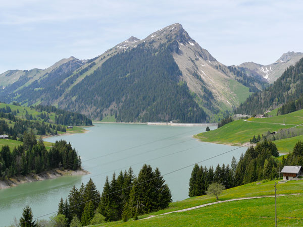 One thousand metres up, to the east, is Le Barrage de l’Hongrin, a man-made and dammed-up reservoir, which is fed by the Hongrin River, other high country tributaries and snowmelt. Snow persists all year round on north-facing peaks. The reservoir drops 32 cubic metres of water per second onto the Veytaux hydroelectric station down below through a vertical and horizontal nine kilometre excavated tunnel big enough for an SUV. The plan is to increase flow to 60 cubic metres per second.