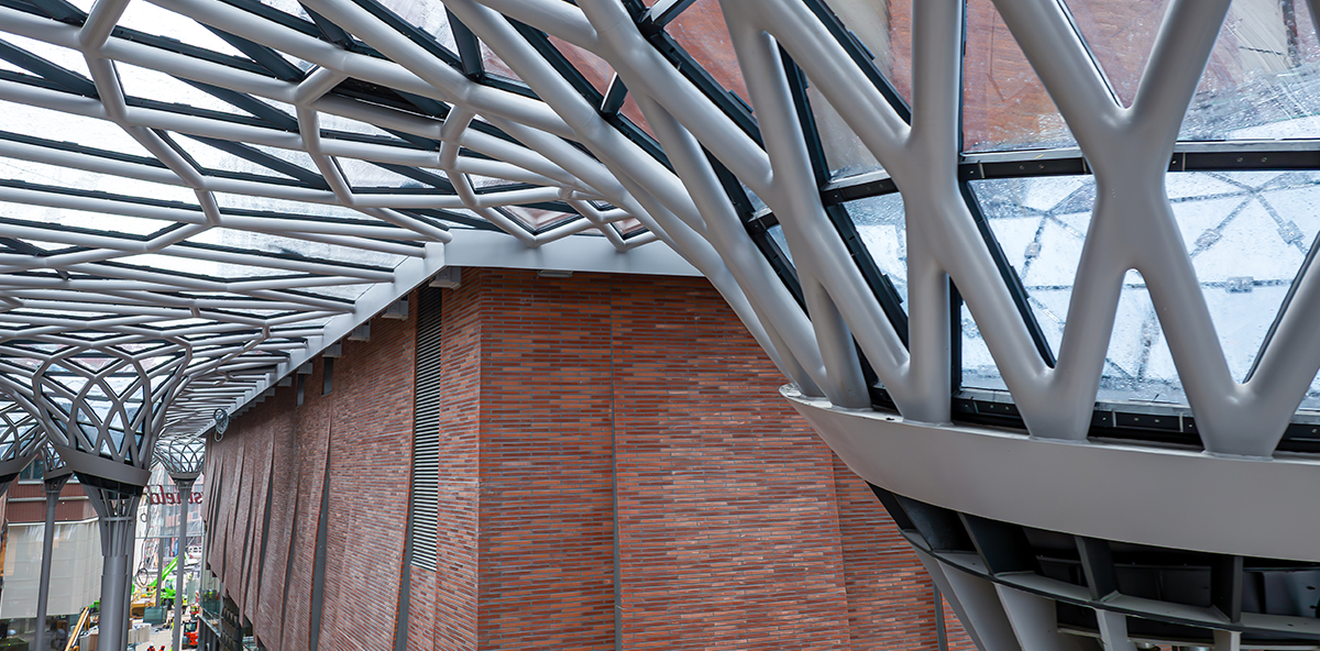 Walking through the Hamburg Überseequartier, visitors are immediately struck by its unique architectural character. However, standing out is an inner glass roof, designed by renowned German star architect Werner Sobek. Assembled with thousands of unique panels, the roof resembles something straight out of a sci-fi movie and appropriately captures the Hamburg-Überseequartier’s identity of a forward-thinking, urban environment.