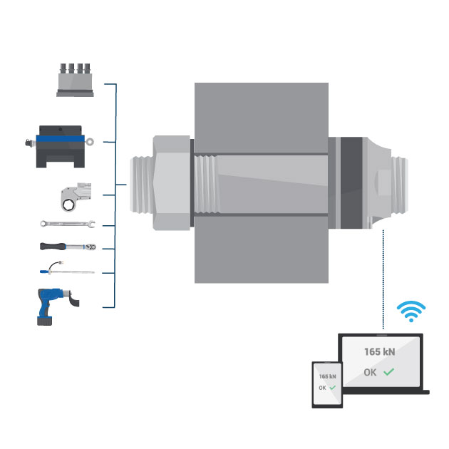 The LSF’s built-in sensors automatically measure and communicate preload values, allowing for seamless remote monitoring; and this SMART product can be used in conjunction with any type of tightening method (tensioning, torquing, heating, etc.).